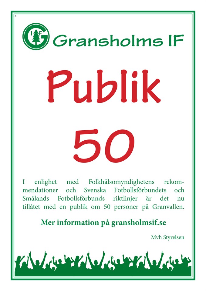 SvFF uppdaterade den 10/8 sina riktlinjer för svensk fotboll under coronapandemin. Nu kan föreningar i vissa fall tillåta en publik på max 50 personer. Information om de uppdaterade riktlinjerna För att vi som arrangerande förening skall uppfylla riktlinjerna kommer det på samtliga matcher finnas matchvärdar som informerar och tillser att riktlinjerna efterföljs. Detta kan medföra att du nekas tillträde eller ombeds lämna Granvallen. Föreningen ber er respektera matchvärdarnas information och uppmaningar. Mvh Styrelsen Gransholms IF 13 aug 2020