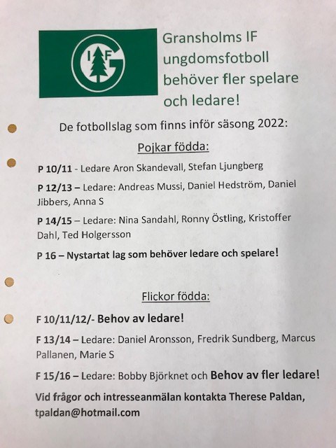 Hej alla! Snart är det dags för våra barn och ungdomar att kicka igång en ny säsong i fotboll. Vi söker ledare för våra ungdomslag. Dessutom söker vi även efter spelare till vårt nya lag i P16. Har du frågor så kontakta Therese Paldan tpaldan@hotmail.com Gransholms IF 3 mar 2022 1kommentar
